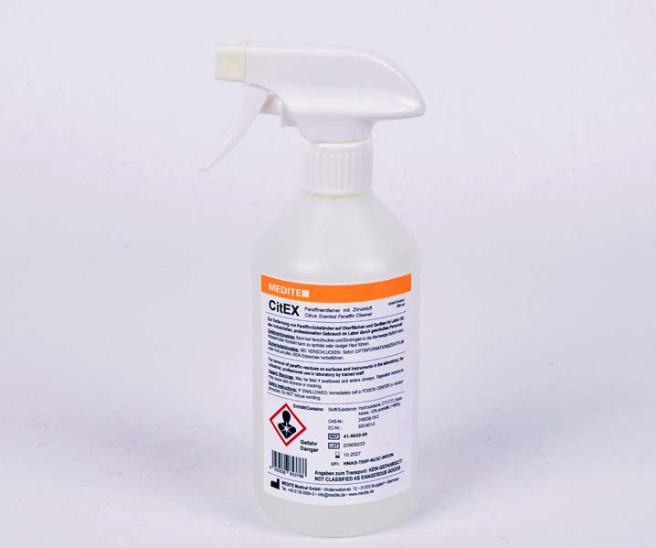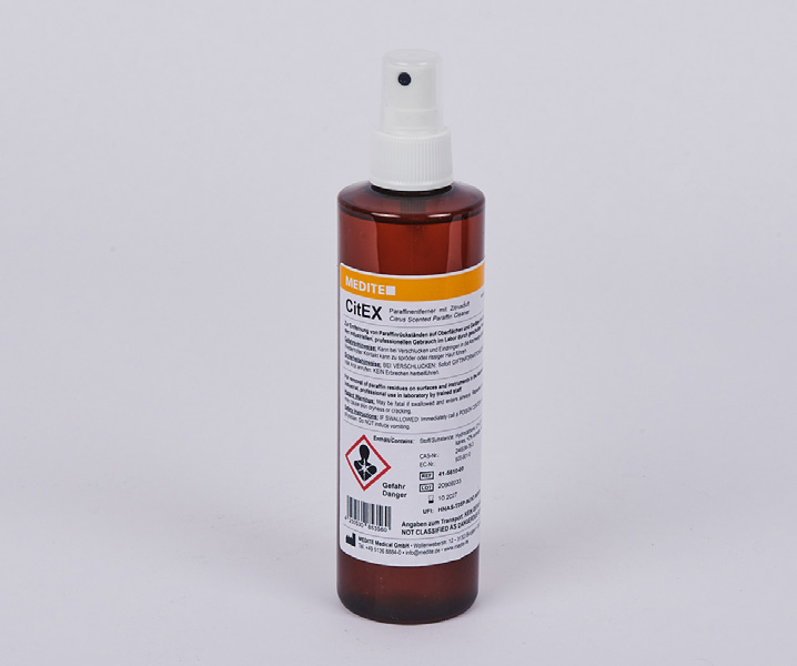 Le CitEX Paraffin Remover est une solution de nettoyage spécialement formulée pour éliminer les résidus de paraffine sur les plans de travail, instruments et équipements de laboratoire.